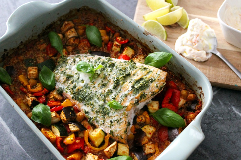 Hasselback-zalm met harissa-groentjes (Jamie Oliver)