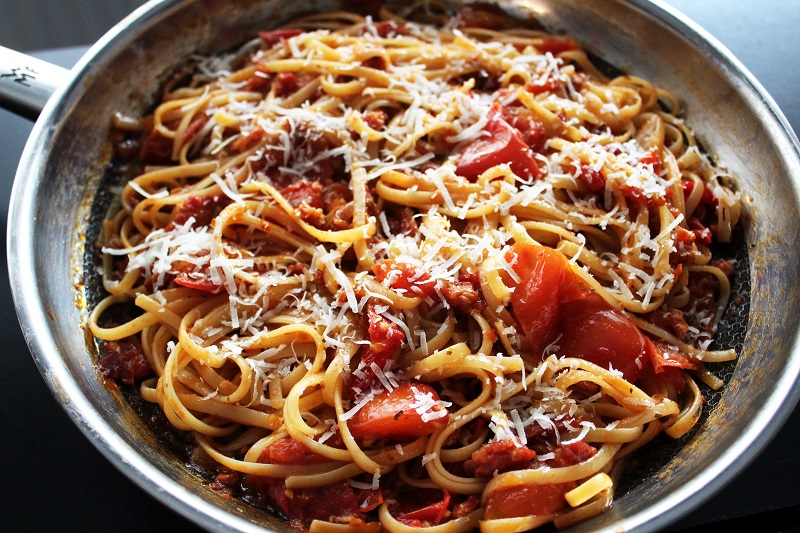 Pasta met chili, bacon en tomaat (Antonio Carluccio)