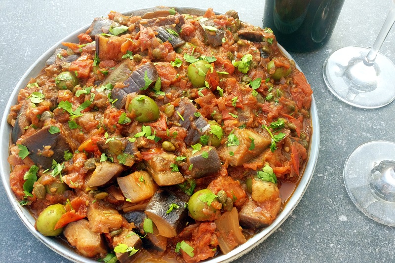 Caponata mag je gerust als het nationale gerecht van Sicilië beschouwen. Deze salade/dikke saus van gekookte groentjes, met een hoofdrol voor aubergine, is er enorm populair. Er bestaan flink wat varianten, van uiterst eenvoudig tot behoorlijk uitgebreid. In dit recept kiezen we voor een eenvoudige, maar typische en smaakvolle, basisbereiding die heerlijk combineert met pasta.