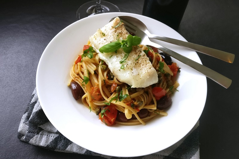 Pasta putanesca is een beroemde klassieker uit Italië. De zilte, ietwat pikante saus op basis van knoflook, ansjovis en chili is zo eenvoudig en toch ontzettend smaakvol. In dit recept voegen we er als extra een mals stukje kabeljauw aan toe. Een eenvoudige maar lekkere en heel doeltreffende aanvulling.