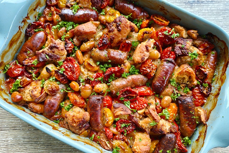 Ovenschotel met worstjes, tomaat en bonen (Jamie Oliver)