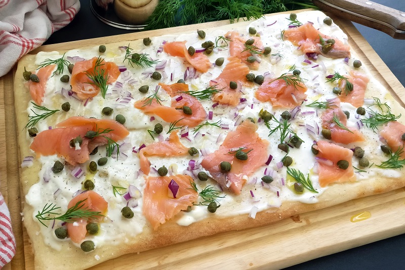 Met platbrood (flatbread) kan je een ruime groep ongerezen, plat brood benoemen. In dit recept kiezen we voor een snelle, handige oplossing door met een pizzabodem te werken. Belegd met mascarpone, rode ui, kappertjes, gerookte zalm en dille levert dat een onweerstaanbaar gerecht op het midden houdt tussen een Italiaanse pizza en Duitse flammkuchen met een Scandinavische toets.