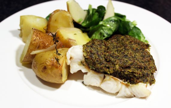 Schelvishaasje met mosterdsaus, boontjes en kroketten (Colruyt)