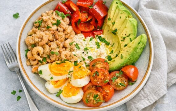 Salad bowl met cottage cheese en garnalen