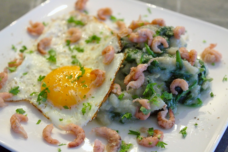 - Lepel de puree op borden. Schik er telkens een spiegeleitje op, vers uit de pan. Bestrooi tot slot met grijze garnalen en peterselie. Smakelijk!