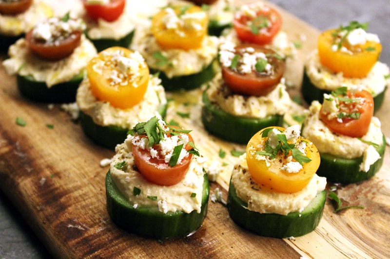 - Halveer de kerstomaatjes, leg op elk schijfje met humus een half tomaatje. Schik ze netjes op een mooie serveerplank of een bord.