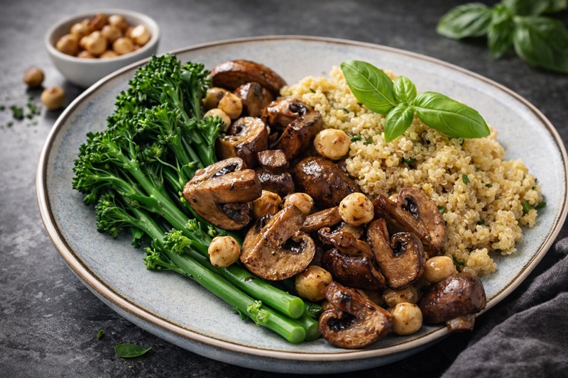 - Roer eenmaal de quinoa gaar is er wat olijfolie door. Roerbak nog even in dezelfde pan. Hak vervolgens de basilicum fijn en meng door de quinoa. Serveer met de uitgelekte broccoli en gebakken champignons. Smakelijk!