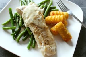 Schelvishaasje met mosterdsaus, boontjes en kroketten (Colruyt) |