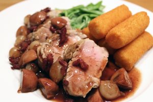 Varkenshaasje met paddenstoelenmengeling in rodewijnsaus