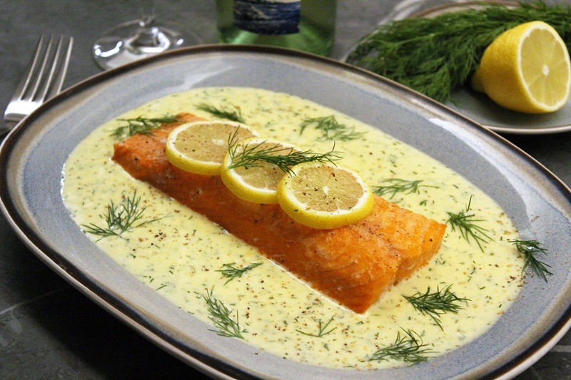 - Serveer de zalmforelfilet(s) op een mooi bord, giet daar de saus rond. Werk af met nog wat dille. Lekker met gestoomde groentjes en puree. Smakelijk!