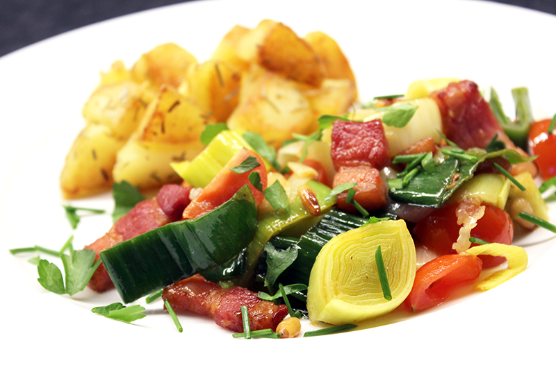 Het succes van gratin is simpel te verklaren: je kan er letterlijke alle windrichtingen mee op. Ook een zomerse, Italiaanse gratin met - jawel - puree (vol groentjes) kan perfect. Dit supereenvoudige en verrassende recept doet er bovendien fakkelspek bij: dunne reepjes gemarineerd spek die op satéprikkers worden gedraaid en tijdens het barbecueseizoen overal te vinden zijn.