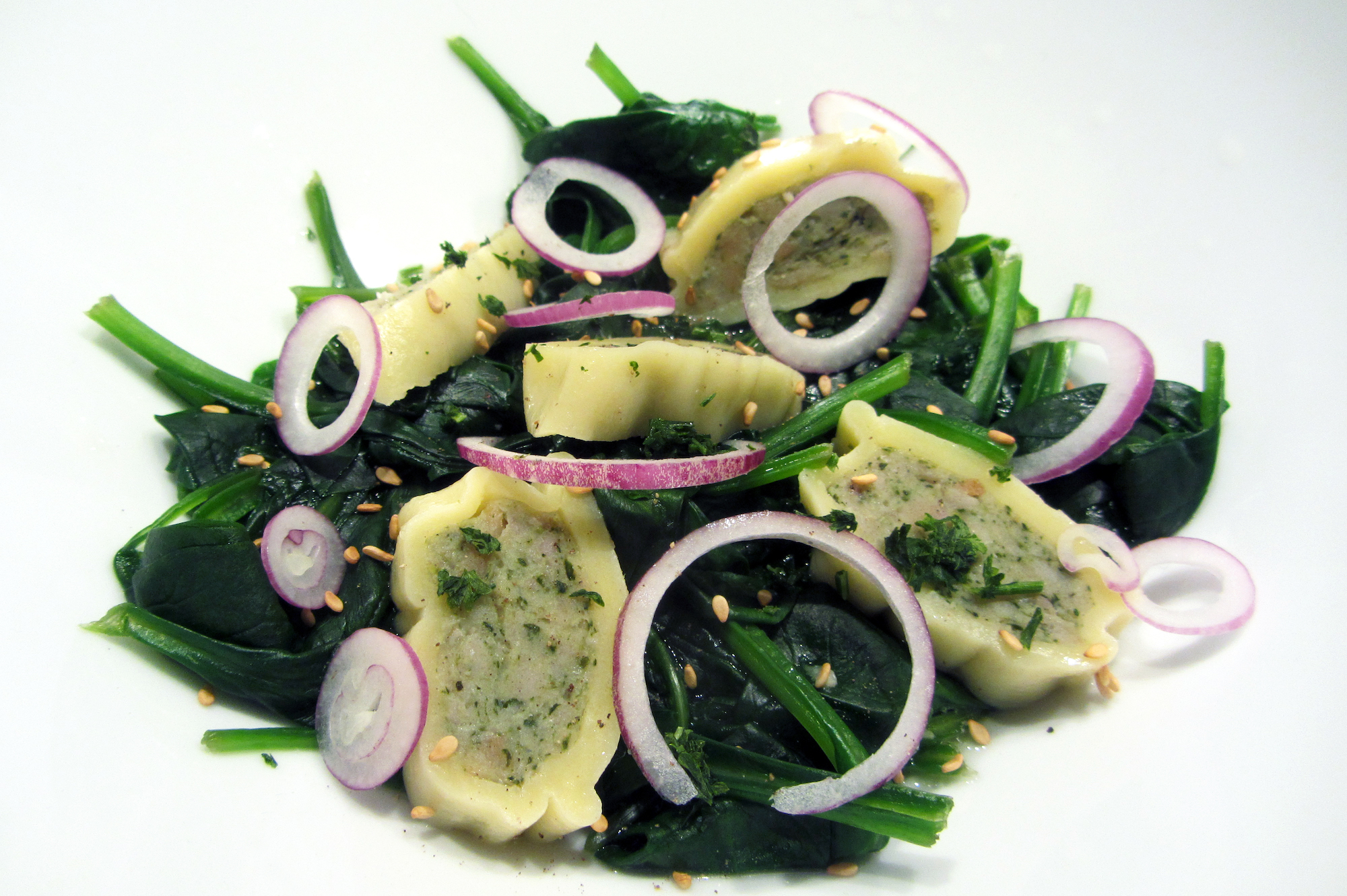 Maultaschen op een bedje van gestoomde spinazie