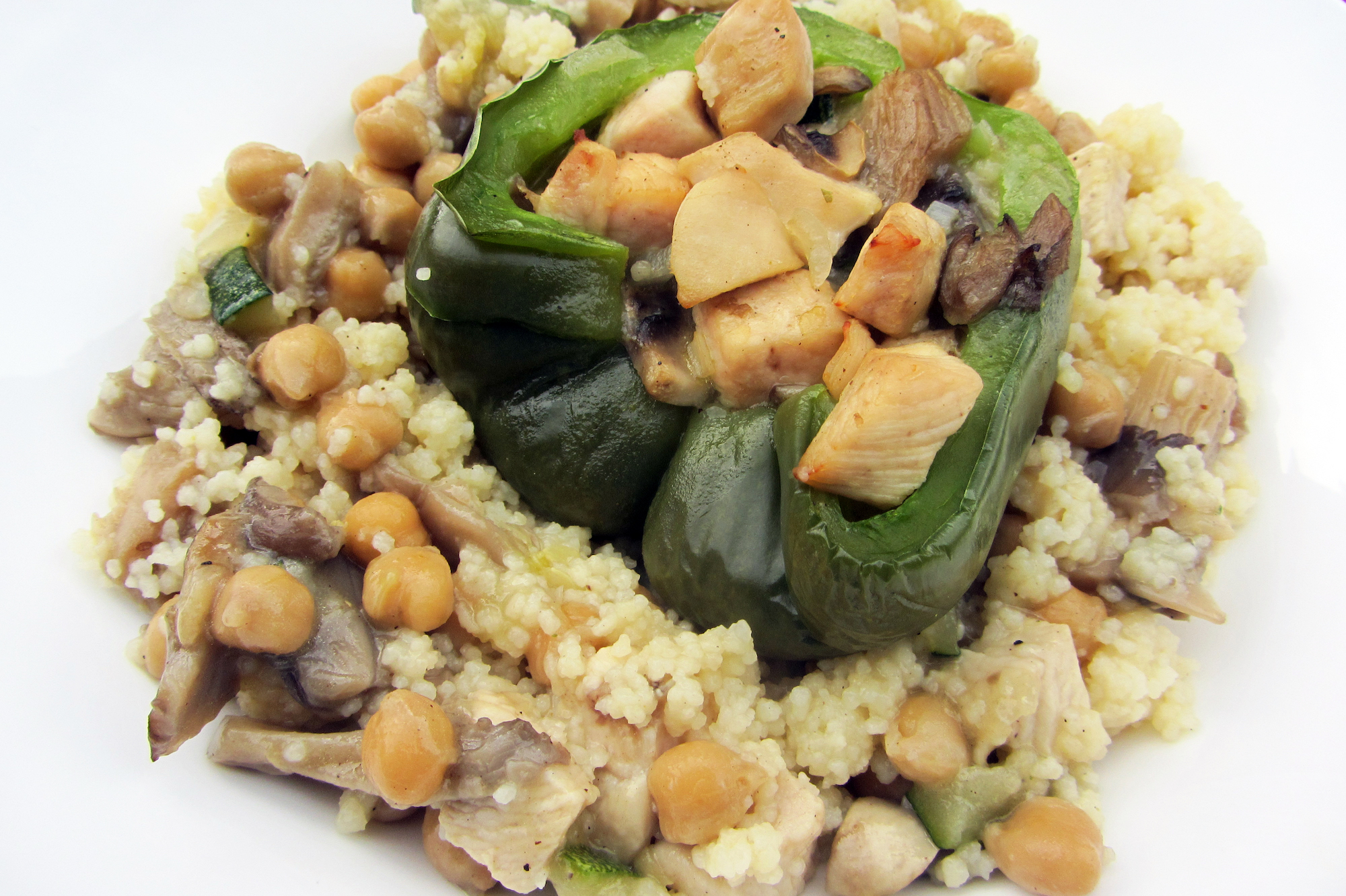 Paprika's kan je altijd origineel inzetten door ze te vullen. Veelal blijft het bij gehakt, terwijl er een veelheid aan opties is. Dit gerecht haalt inspiratie uit verschillende zuiderse keukens om een heerlijk gerechtje op tafel te toveren: paprika's gevuld met kip, champignons, oesterzwammen en courgette, vergezeld van smeuïge couscous met kikkererwten.