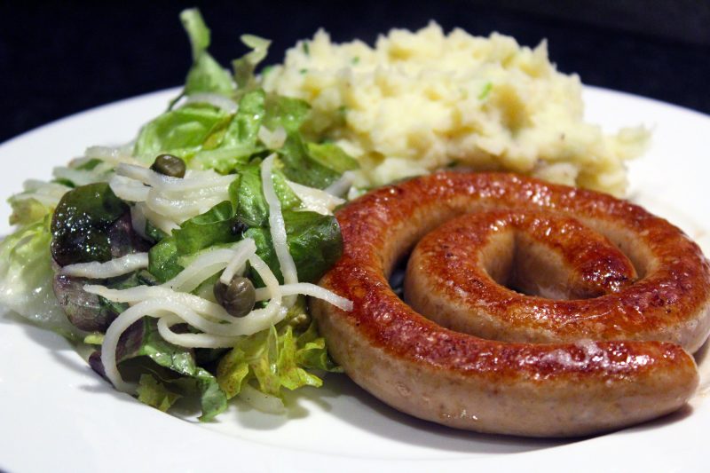 Chipolata met aardpeerpuree en frisse knolseldersalade