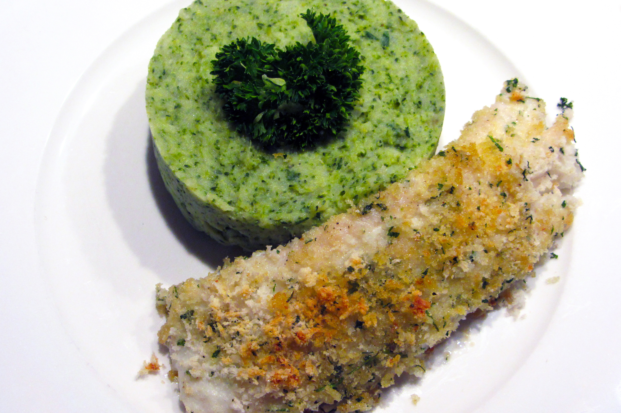 Schelvisrug in krokant kervelkorstje met brocollipuree