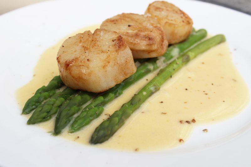 Asperges met Sint-Jakobsvruchten en mousselinesaus